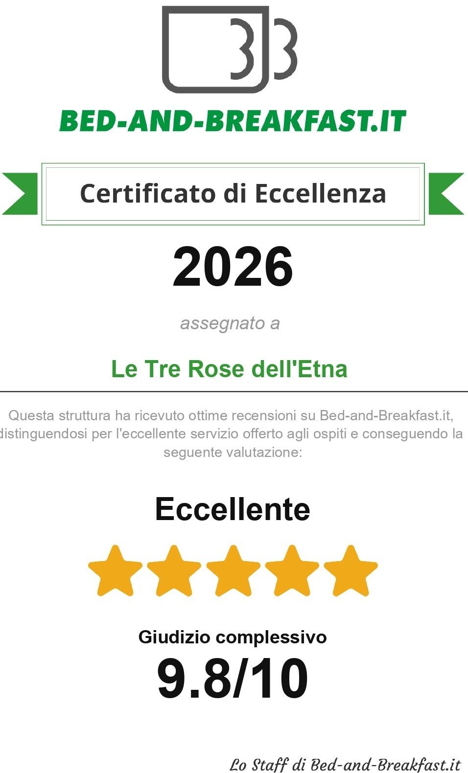 "LE TRE ROSE DELL’ETNA" è un B&B in affitto turistico situato al secondo piano di una villa ubicata a pochi passi dal centro di Zafferana Etnea, alle falde del più grande vulcano attivo d'Europa “ETNA”, patrimonio dell’Unesco, all’interno del Parco Regionale dell’Etna, posto ideale per le vostre vacanze estive ed invernali. Una casa vacanze ideale per famiglie numerose o gruppi di amici che vogliono trascorrere piacevoli momenti di relax. La struttura dispone di 3 camere da letto con possibilità di letti aggiuntivi, ampie ed arieggiate con balcone, inoltre vi è una grande cucina-soggiorno, comunicante con una veranda chiusa a vetri, attrezzata di tavolo e sedie, dove è possibile trascorrere piacevoli momenti di relax ed ammirare uno stupendo panorama dell’Etna e della costa Ionica. La cucina è dotata di tutto l’occorrente per cucinare, 2 bagni non in camera ma privati per ogni camera: uno con vasca da bagno e uno con doccia, che offrono tutti i miglior confort ai clienti (climatizzazione in tutte le stanze da letto, riscaldamento TVC lcd, wi-fi gratuito, frigorifero, lavatrice, ferro, asse da stiro, phon, Biancheria per tavola/letto/bagno (a richiesta), cassaforte e un ampio parcheggio auto all’interno). La casa “LE TRE ROSE DELL’ETNA” è un ottimo punto di partenza per piacevoli escursioni infatti, dista a soli 22 km dalla funivia dell’Etna, a 30 km da Taormina e dalle gole dell’Alcantara, a 12 km dal mare, a 9 km dallo svincolo dell’autostrada A18 (uscita Giarre), a 13 km da Acireale, a 15 Km dalla Riviera dei Ciclopi, e a 25 km da Catania.